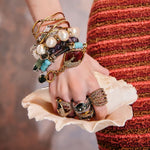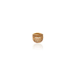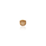 Uma peça que carrega o calor do sol mediterrâneo em cada detalhe. O design bombê envolve os dedos como uma escultura luminosa, realçada pelo brilho hipnótico dos cristais e pela intensidade dos metais trabalhados com maestria.