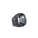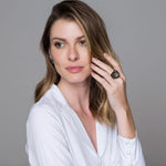 No banho grafite, a pedra natural quartzo branco se une aos cristais transparentes e em tons de azul, verde, branco e cinza. Peças especiais recebem a pedra natural Jaspe Black Net e Quartzo rosa. As peças também recebem pérolas naturais e Swarovski.