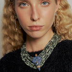 A coleção traduz esse espírito livre em peças marcantes, onde cores profundas e texturas naturais se encontram em composições intensas e sofisticadas. Pedras naturais como jaspe oceano, sodalita, rodocrosita, quartzo morango, quartzo negro, fluorita e serpentinita revelam uma paleta rica e cheia de personalidade, enquanto a resina marfim traz equilíbrio e suavidade às criações. Cristais luminosos completam as peças, adicionando brilho e movimento.