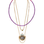 Materiais: Cristais, Quartzo Verde, Jade Roxo e metais com banho em ouro velho.