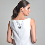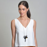 Família Samantha - As Ilusões e os paralelos entre o real e o que engana os nossos olhos são o ponto de partida para a nova coleção de Inverno 19 Camila Klein com famílias de nomes inspiradas no universo do feitiço e da bruxaria. Composições de linhas e ângulos em metais esmaltados formam a principal característica da família Samantha, complementada pelo uso de cristais triangulares que reforçam um visual super geométrico. Cristais longos e ovais e pingentes de cristal com lapidação irregular desequilibram a geometria e trazem ineditismo.