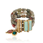 Materiais: Cristais, pedras naturais como jaspe sangue de dragão, labradorita, pedra da lua, ágata de fogo, amazonita e metais com banho em ouro velho.