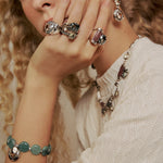 As peças traduzem essa energia pulsante em composições exuberantes, onde pedras naturais coloridas e cristais se unem em formas marcantes e cheias de presença. Cada criação carrega a ideia de proteção e potência, como um amuleto contemporâneo que acompanha a mulher em sua própria jornada.